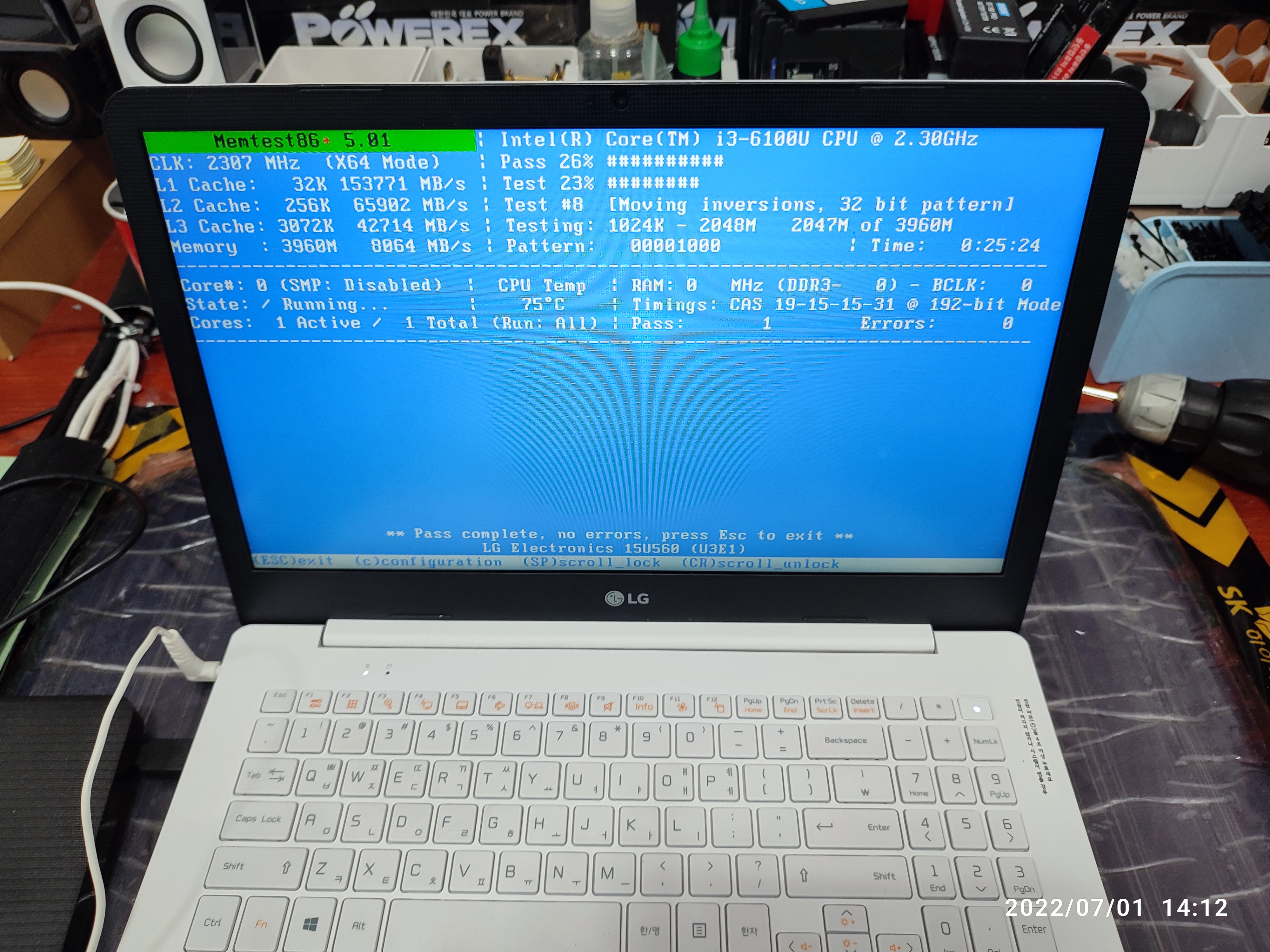 쿨링패드를 사용하지 않았을 때, 메모리 테스트 중 CPU 온도는 75도까지 올라갔네요.