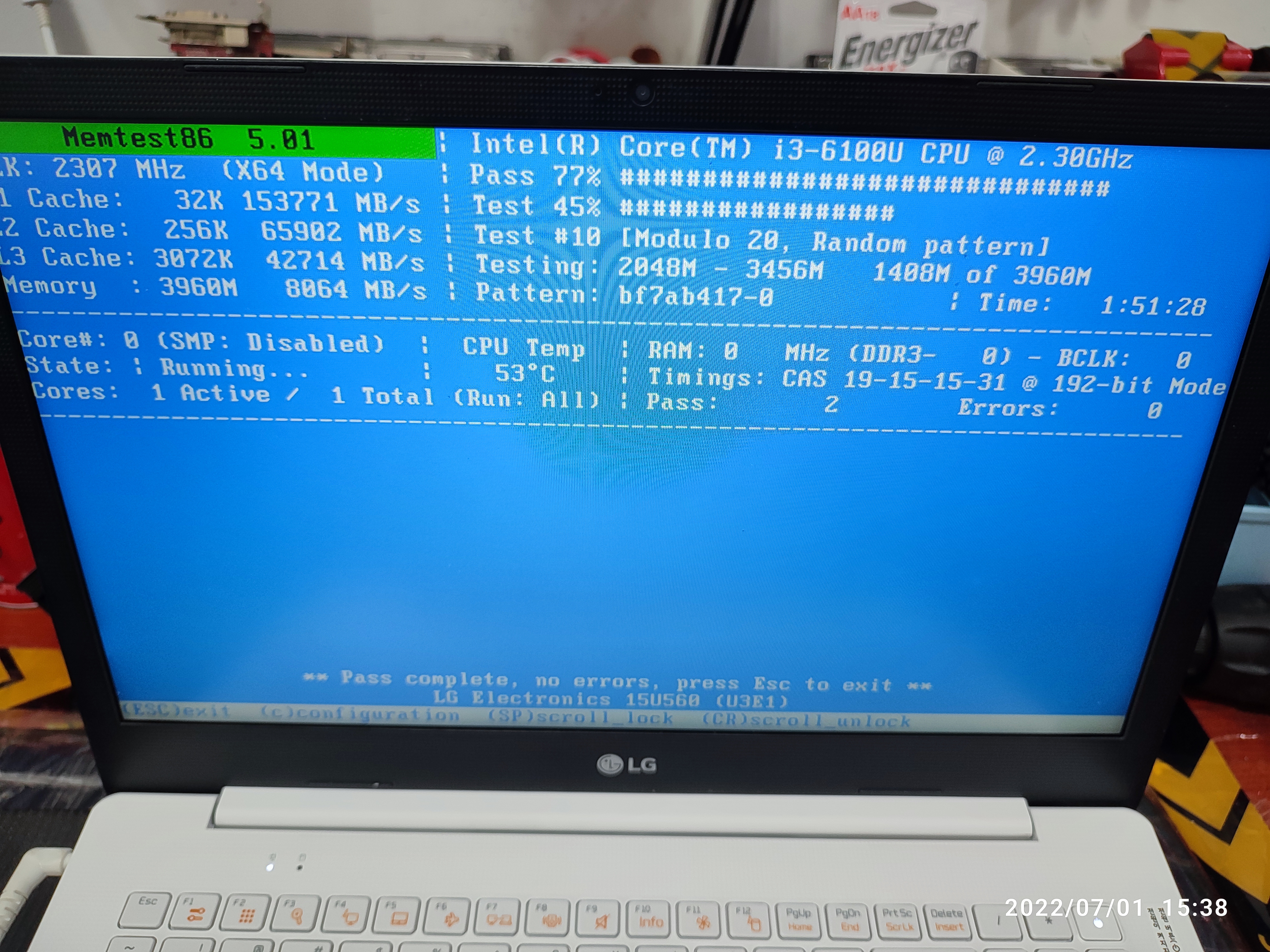 쿨링패드를 깔아놓고 메모리 테스트를 진행하면, 2시간 정도 테스트를 했을 때, 53도가 유지되고 있네요.