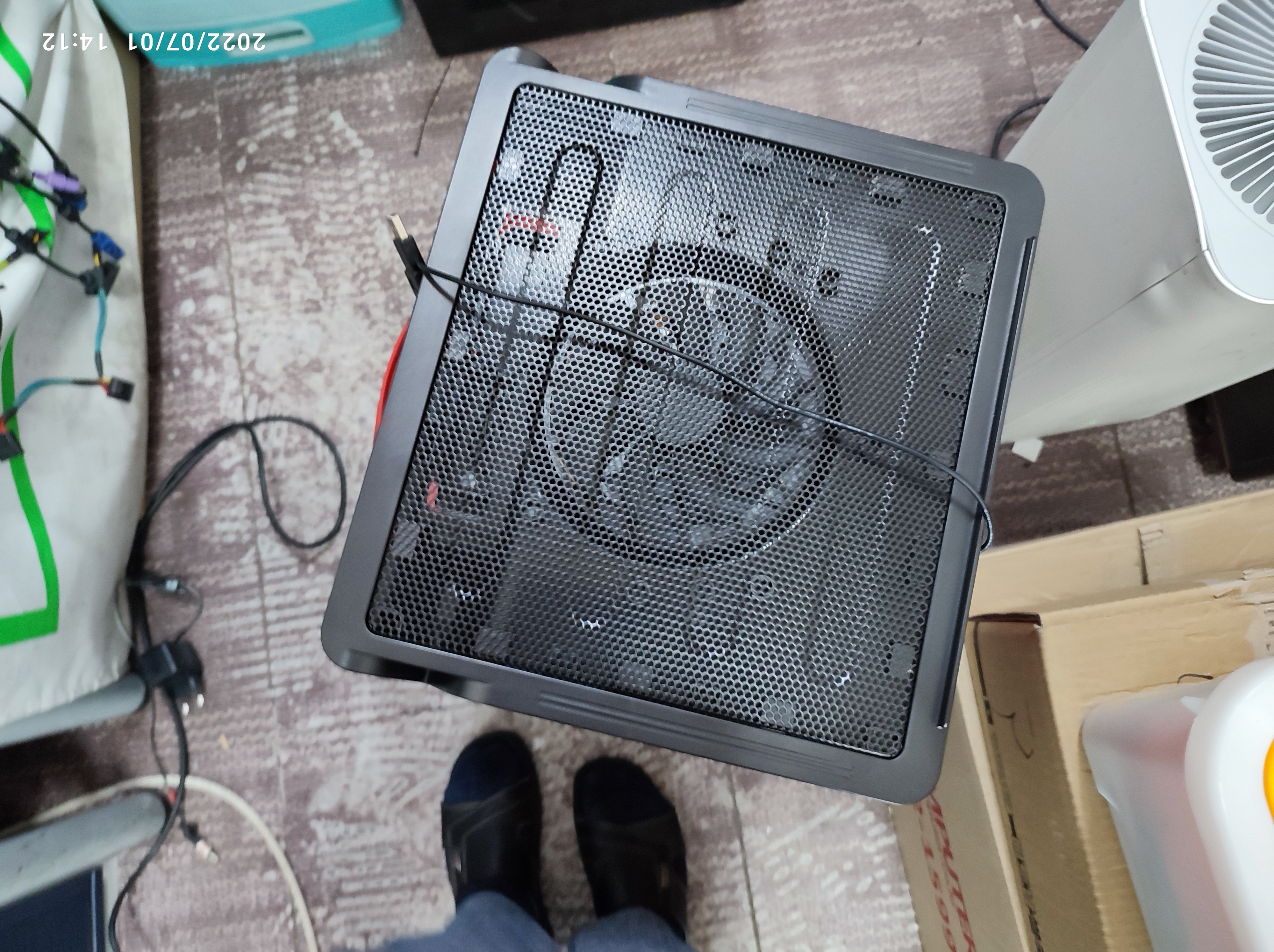 노트북 쿨링패드입니다. 밑에 팬이 달려있는 제품이라서, USB 포트에 팬 전원을 연결하면 노트북 밑판을 식혀줍니다. 노트북이 데스크탑 대용으로 집(사무실)에서만 사용하고 밑판을 열어둘 수 있는 노트북이라면, 밑판 뚜껑을 열어놓고 사용하면 조금 더 효율적으로 노트북 발열을 잡아줄 수도 있습니다. (일반적으로는 밑판을 제거하면 안되는 노트북이 많습니다.)