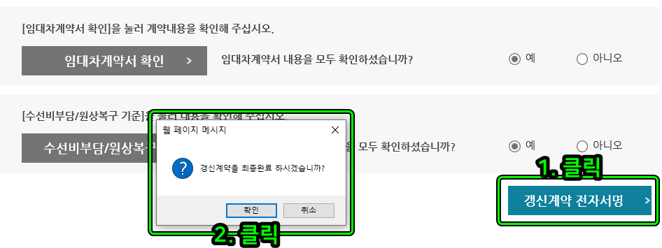 9. 갱신계약을 최종완료 하시겠습니까? 확인 클릭