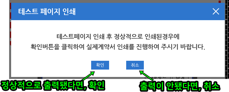 테스트 페이지가 출력되지 않은 경우에는 취소를 눌러서 다시 테스트를 진행합니다.