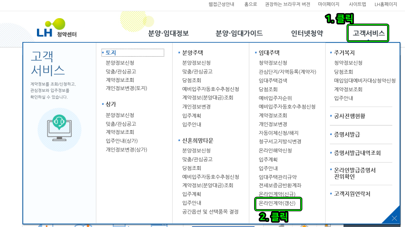 2. LH 청약센터 - 고객서비스 - 온라인계약(갱신) 클릭