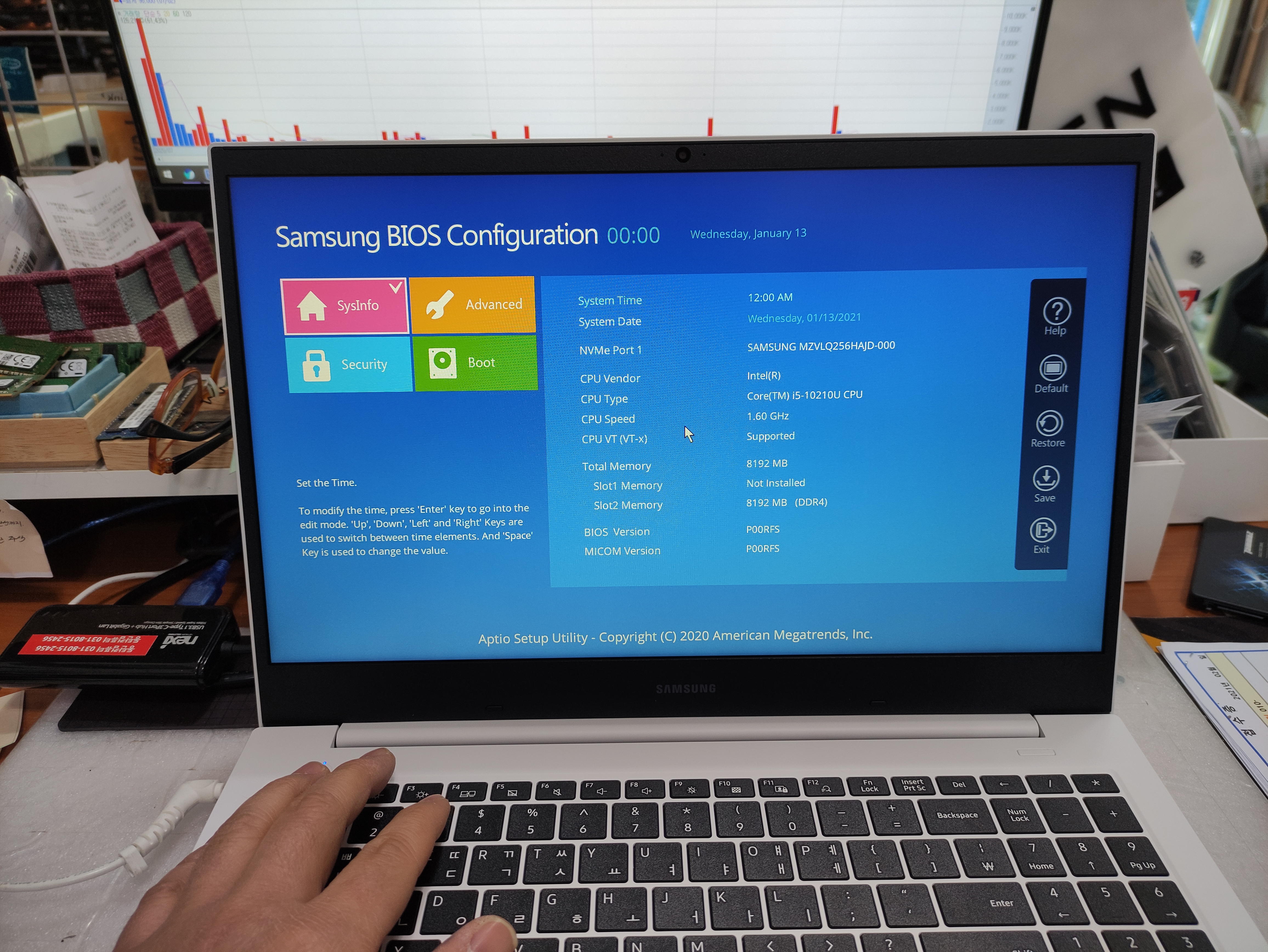Samsung BIOS Configuration 화면으로 들어가봤습니다. 2021년 02월 04일 개봉한 상품인데요. 시스템의 날짜를 2021년 01월 13일로 맞춰져 있네요? 인텔 CPU i5-10210U (1.6GHz), 8GB (DDR4) 메모리, 삼성 MZVLQ256HAJD-000, 바이오스 버전 P00RFS 입니다.