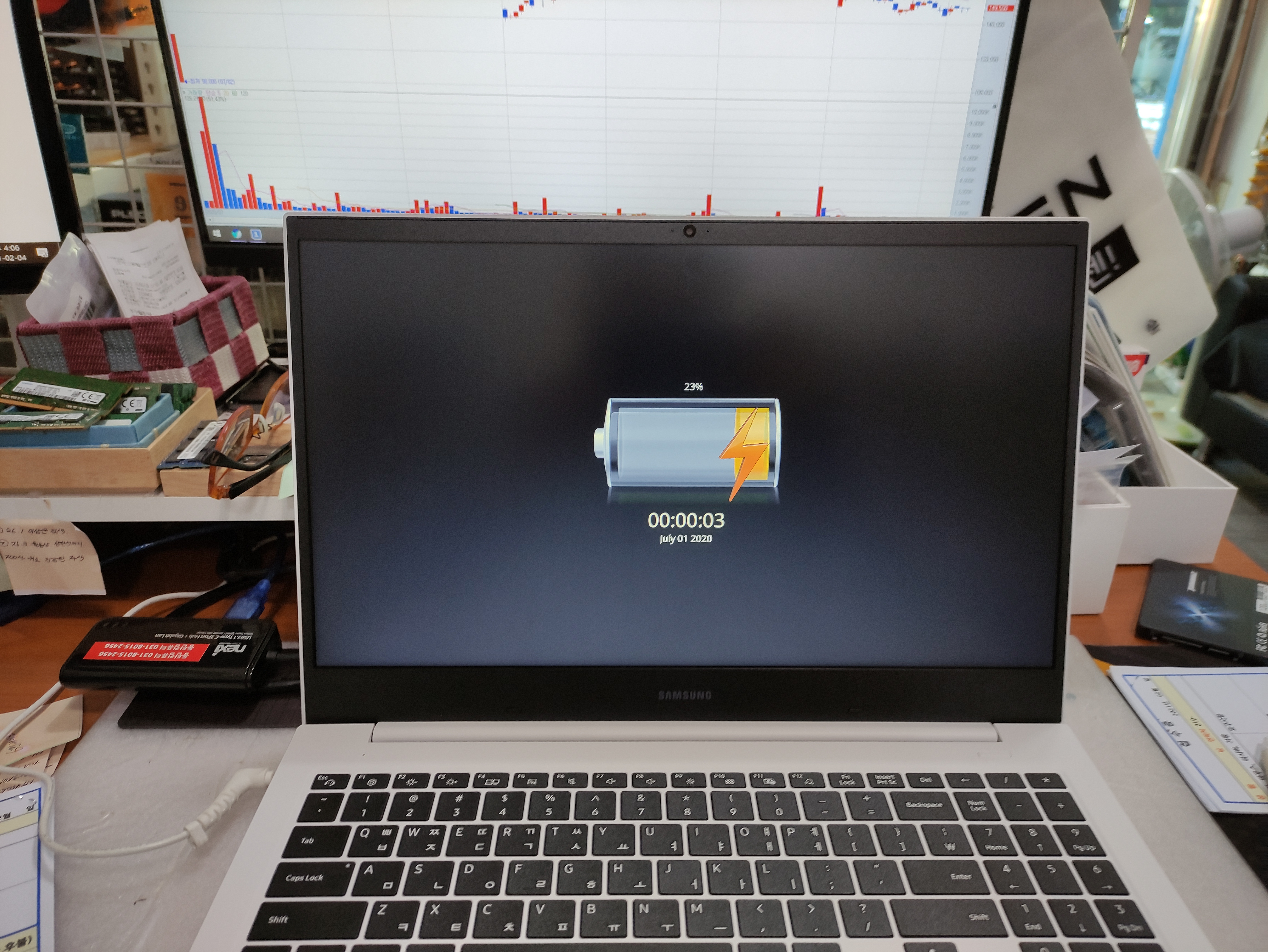 전원커넥터를 연결하자, 배터리의 잔량을 표기해주는 편리한 기능이 있네요. 배터리는 23% 정도 충전된 상태로 배송이 왔습니다.