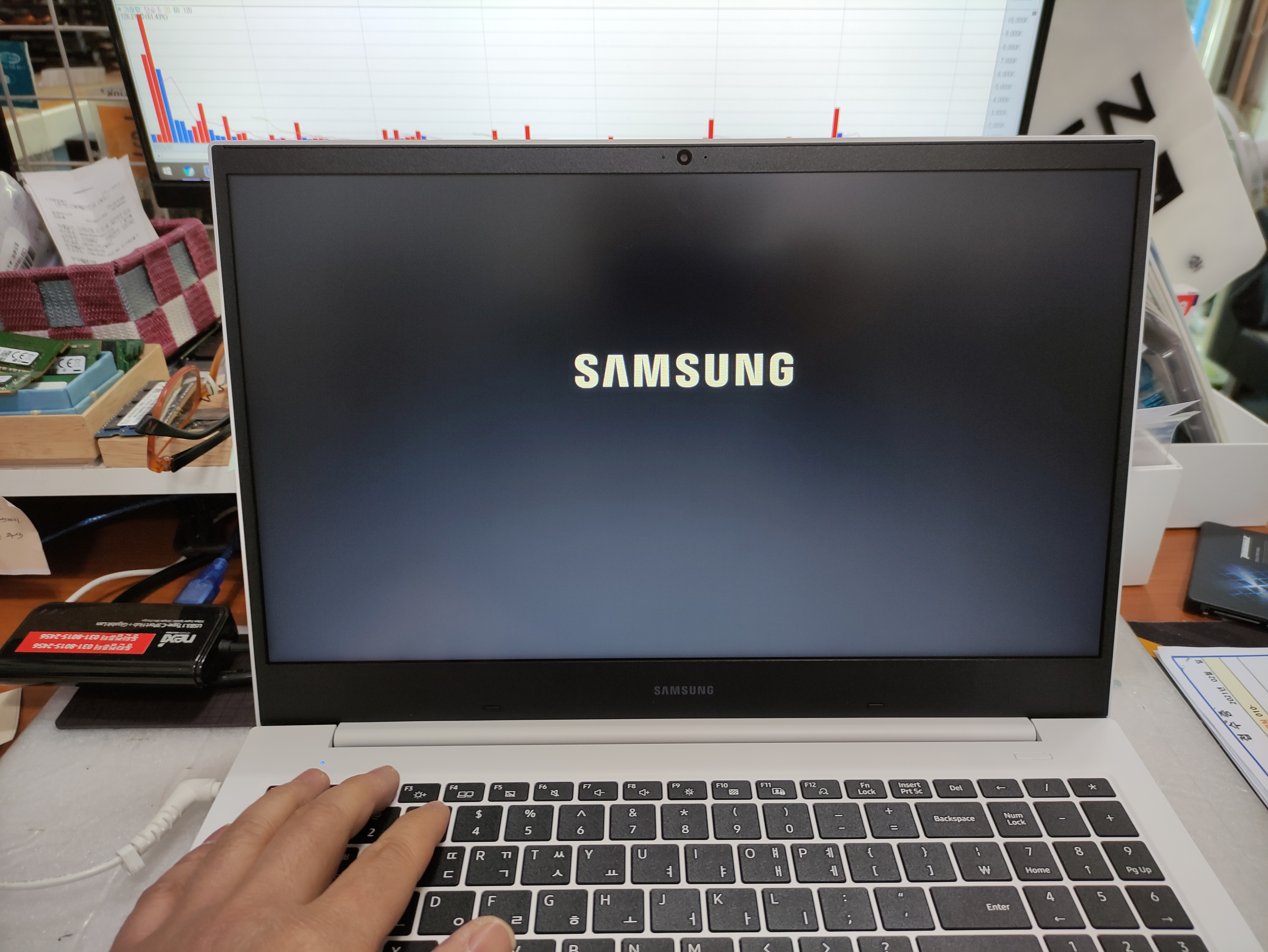 전원 버튼을 눌러서 전원을 인기하니 삼성전자로고가 뜹니다.