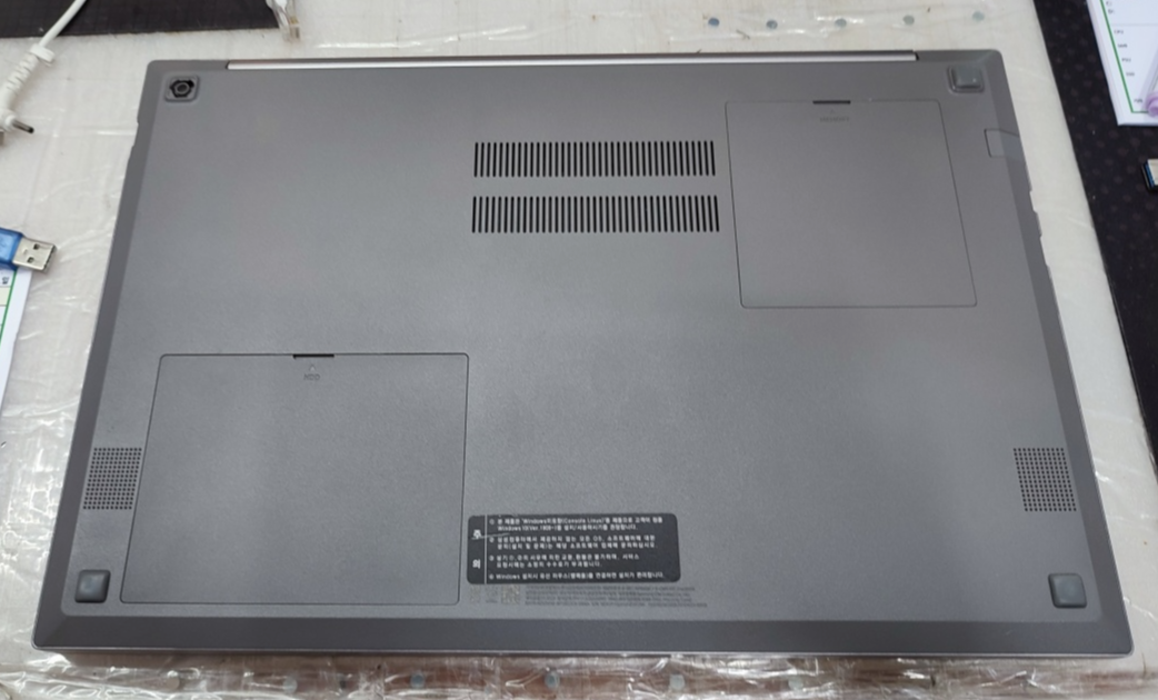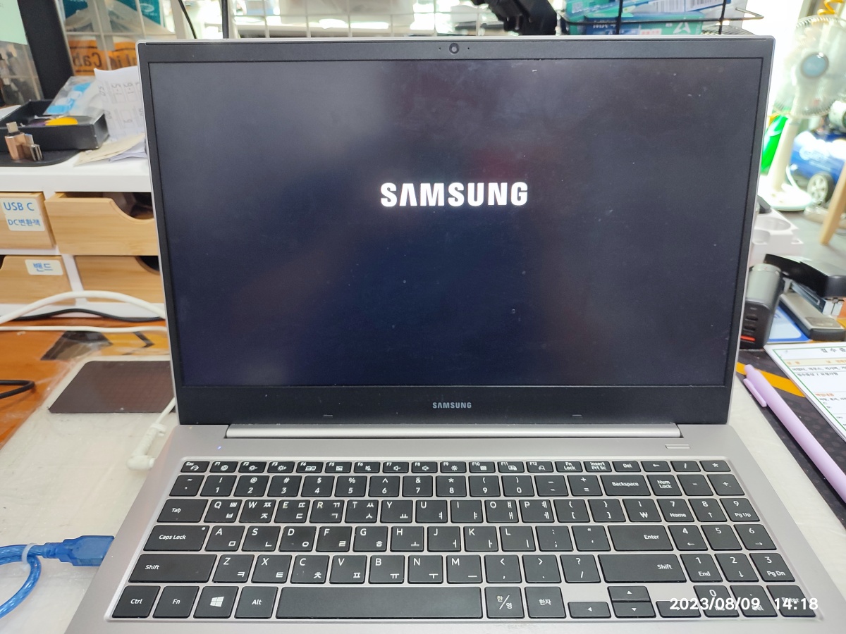 (저장 장치) SSD 테스트를 위해서, 제 테스트용 삼성 SSD를 연결해서 윈도우 부팅 테스트를 진행했습니다. 제 SSD로 부팅하면 노트북이 정상적으로 부팅되는 모습을 확인할 수 있었습니다. 테스트를 마치고 SSD 불량으로 진단하고 삼성 M.2 SSD 500기가 신품으로 교체했습니다.