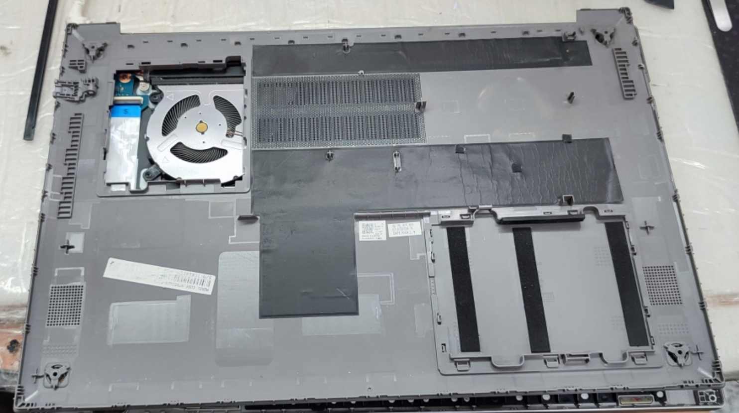 테스트를 위해서 노트북 케이스를 분해하고 있습니다. 좌측 상단의 미끄럼 방지 패드가 없는 상태로 입고됐습니다.