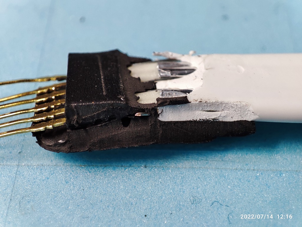 사타 포트를 만드는 것도 사타 케이블의 제조사에 따라서 방법이 다양합니다. 어떤 제품은 납땜해놓은 제품도 있고 어떤 제품을 납땜하고 글루건 같은 재질로 덮어놓은 곳도 있고요. 아래의 제품은 납땜한 건지 확대해서는 잘 안 보이지만 금색 금속으로 은색 전선을 집어둔 거 같은 느낌이네요.