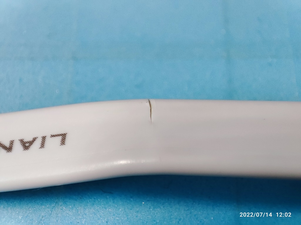아래와 같이 사타 케이블 중간에 칼날로 외피 일부가 커팅됐습니다. 찢어진 부분을 보여주기 위해서 휘어서 더 찢은 상태입니다.