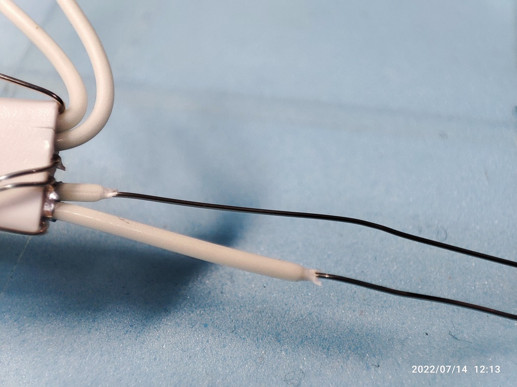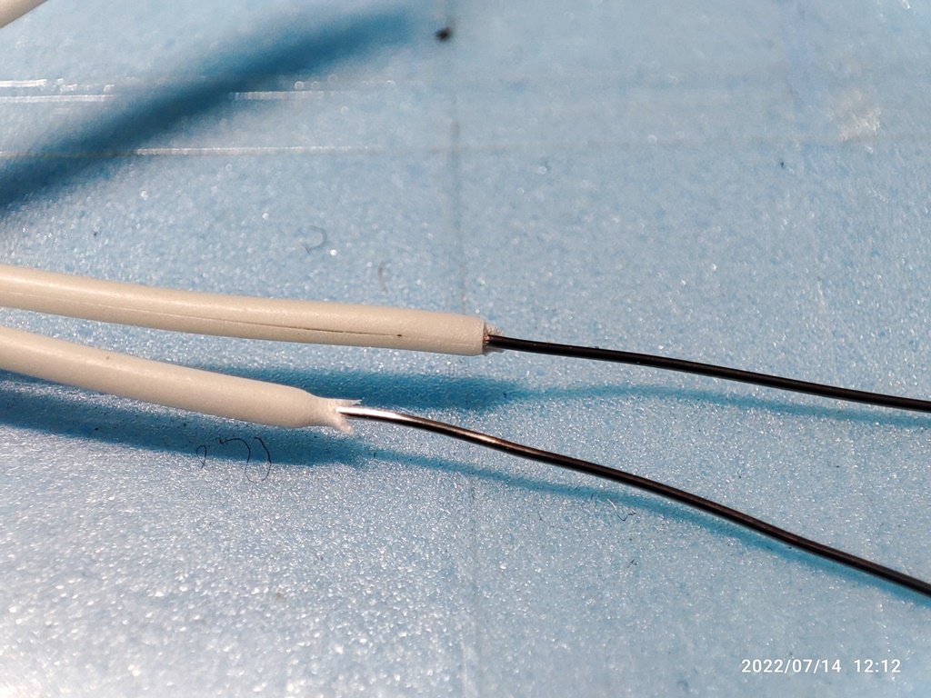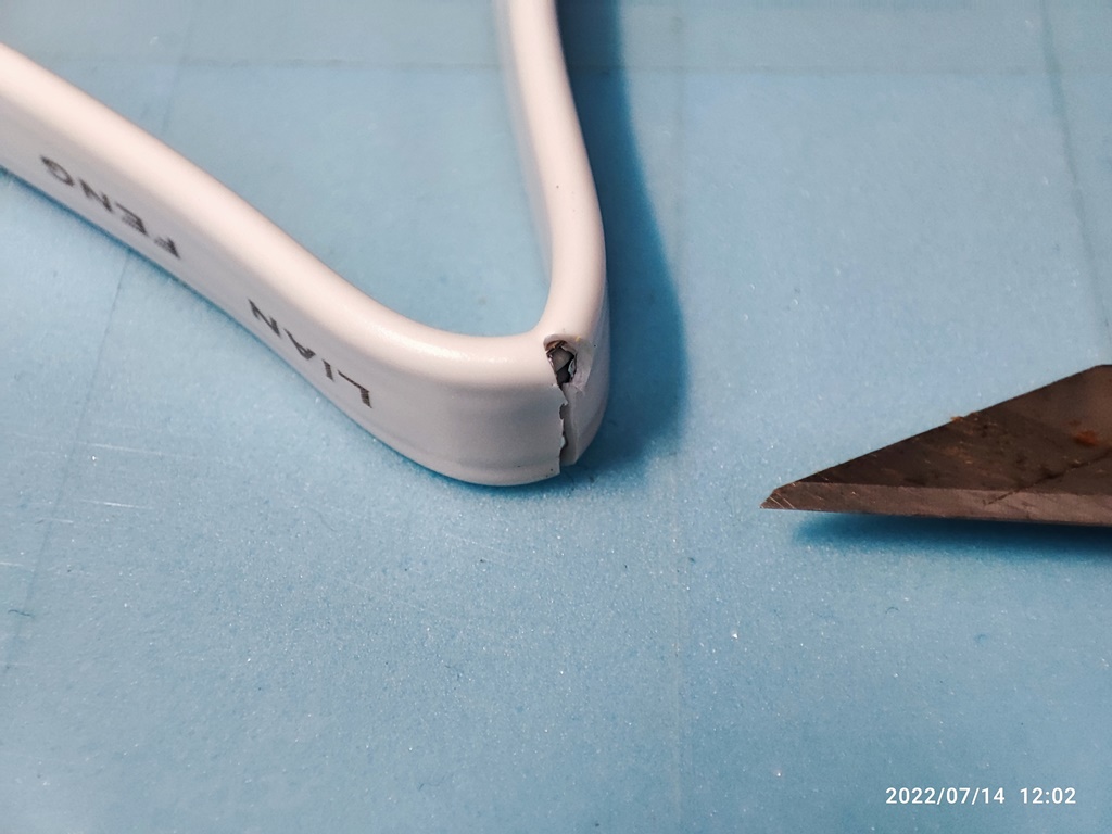 아래는 니퍼로 얇은 금속을 집어본 사진인 거 같네요. 금속이 무르기 때문에, 케이블이 꺾이거나 찍히면, 내부는 이렇게 얇아지는 구간(케이블 변형)이 생길 수 있습니다. 얇아진 구간은 정상적인 굵기보단 좁아져서 저항이 높아질 수 있는 구간이 생길 수 있습니다.