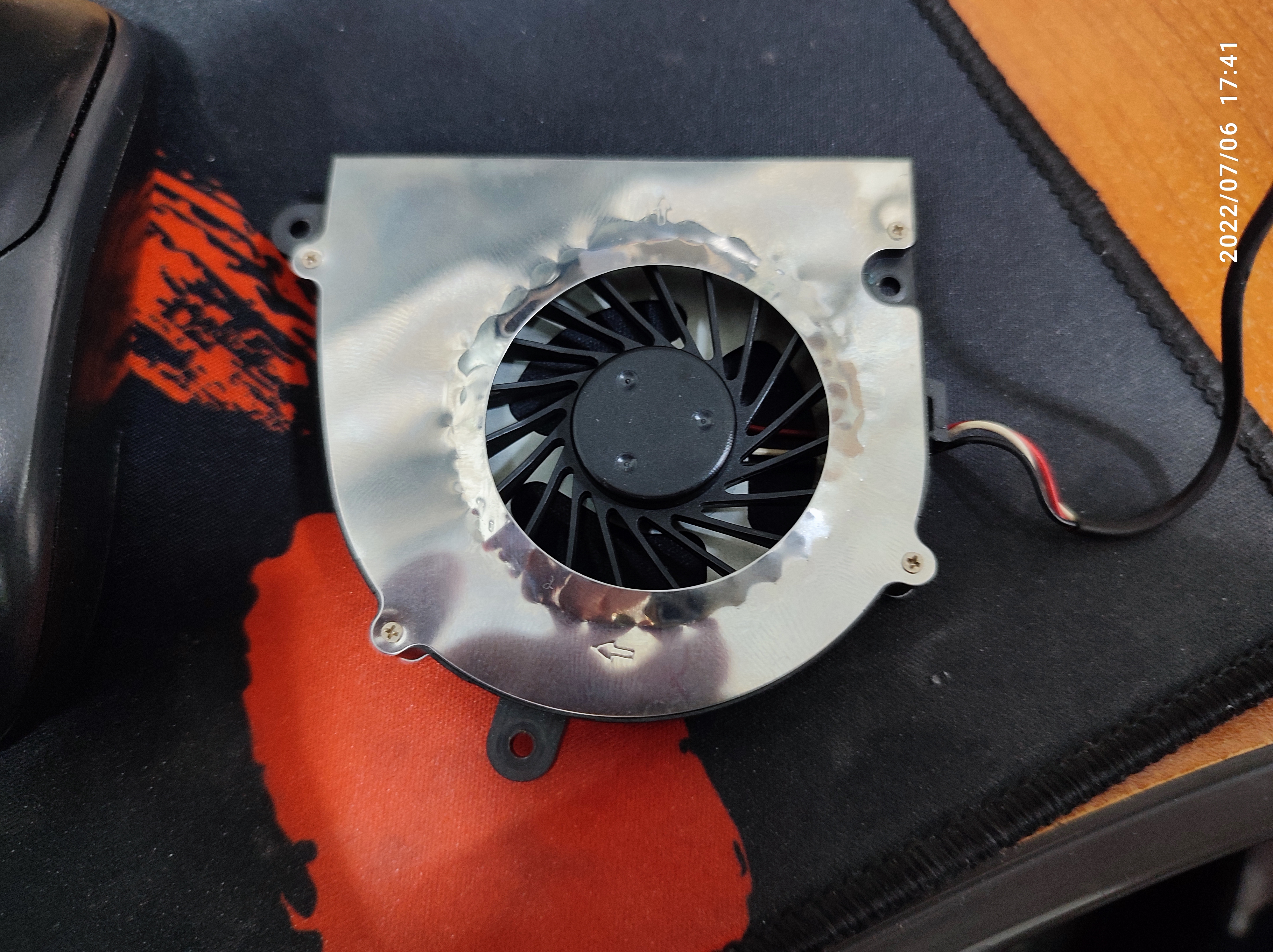 그래서, 팬 덮개를 제거했습니다. 공기의 흐름이 흩어지니깐 덮개가 있는 게 내부 공기를 밖으로 빼기가 쉬울 거 같기는 한데요. 이렇게 걸려서 최대 속도보다 천천히 돌아가나, 덮개를 제거 후 원래 속도로 돌리면 팬 성능은 비슷할 거 같습니다. 일단은 새 팬은 주문해 놓은 상태이기는 합니다. 노트북이 동작 중에 꺼지면, 배송될 새 FAN으로 교체할 생각입니다.