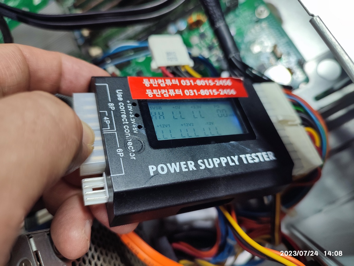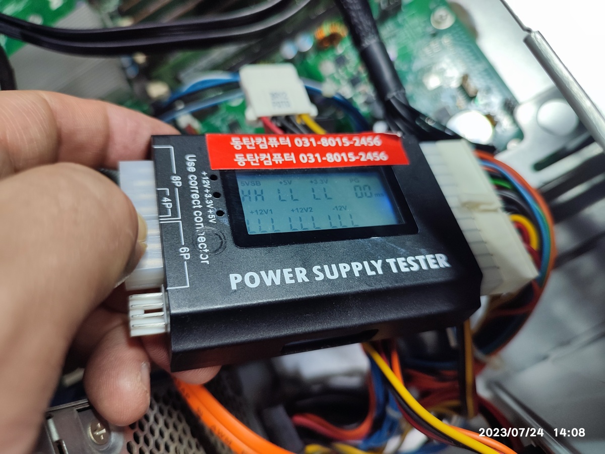 기존에 장착된 파워서플라이를 테스트기에 연결해봤습니다. 아래와 같이 LL(전압이 낮다고)이 많이 뜨네요. 액정도 희미해서 눕혀서 봐야 숫자가 읽어집니다.