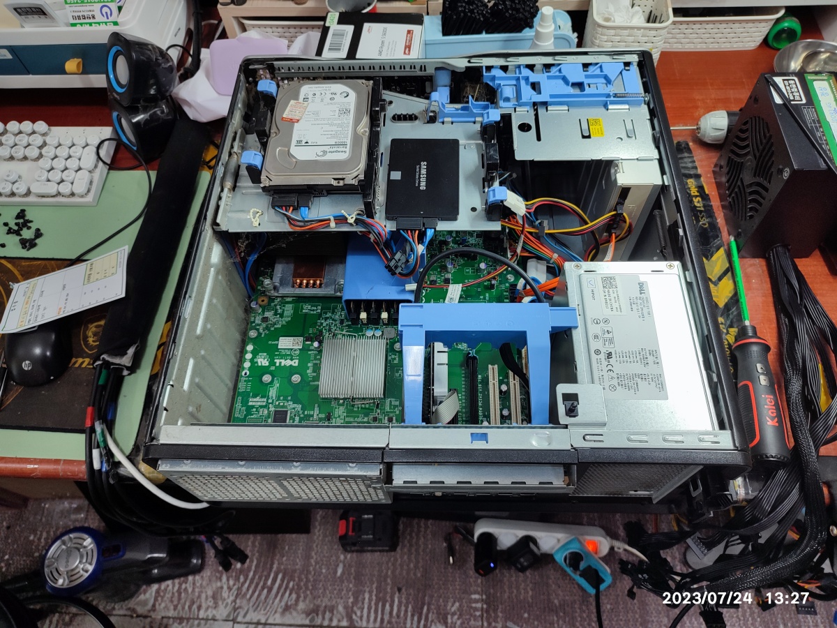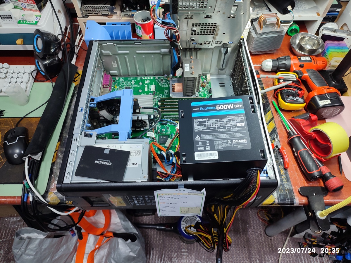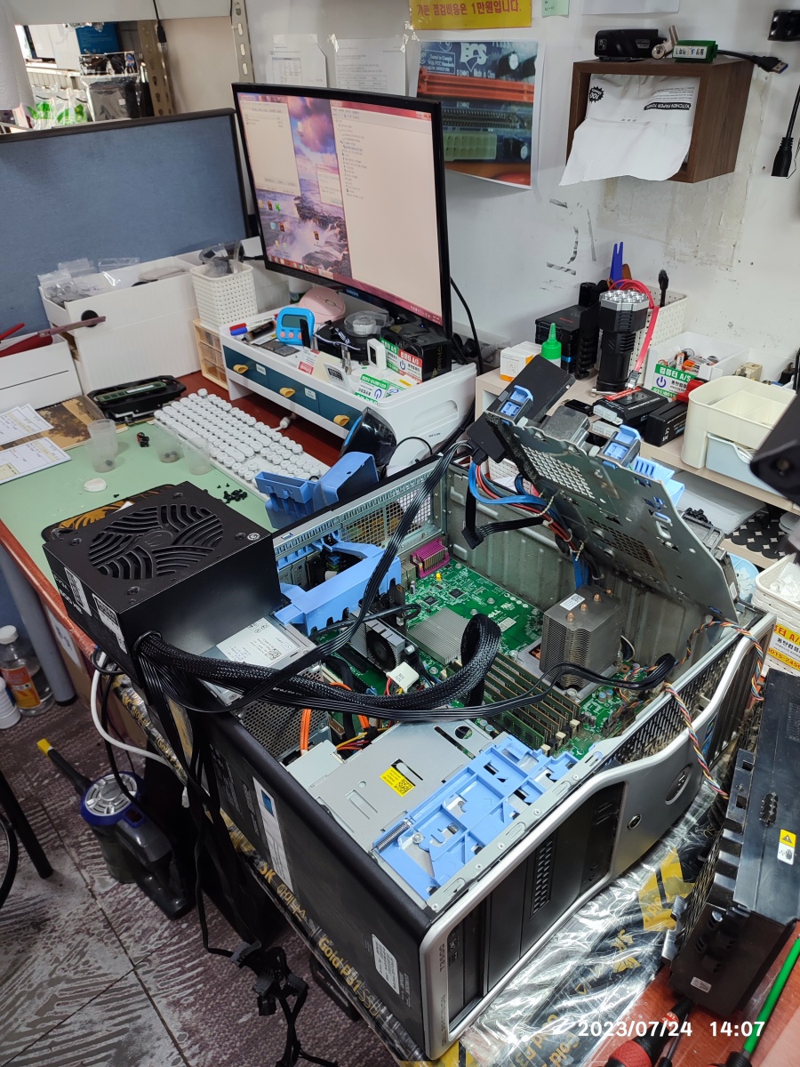 2023년 07월 24일 입고된 델컴퓨터입니다. 서버급의 크기입니다. 컴퓨터 수리대 올려 놓으면 밖으로 삐져나옵니다. 무게도 무거워서 무릎 굽혀서 들지 않고 잘못 들면 허리 다칠 수도 있습니다.