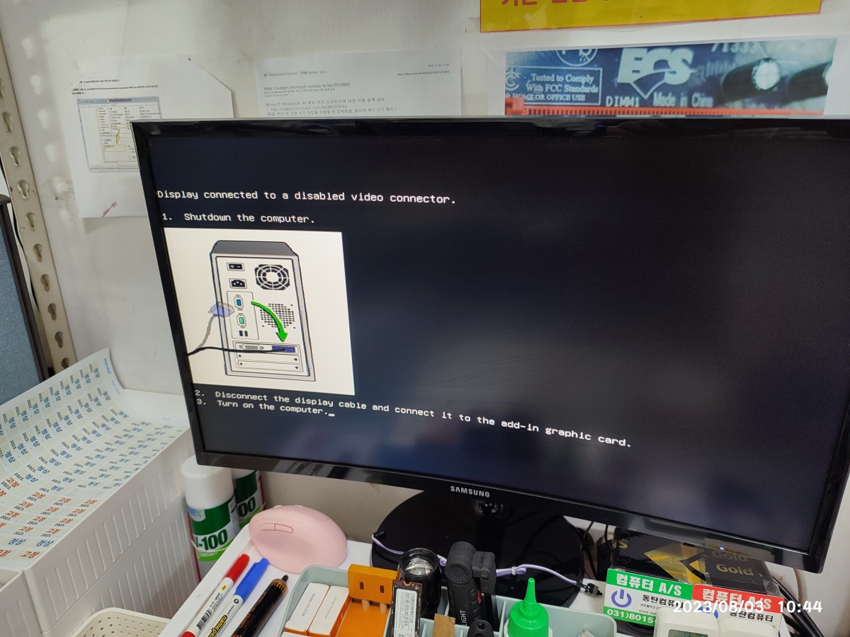 밑에 추가 그래픽카드가 장착된 걸 못 보고 내장 그래픽카드에 모니터를 연결했더니, 아래와 같은 안내창이 뜹니다. 대부분의 컴퓨터에는 없는 기능인데, 델에서 이런 편의 기능도 넣어뒀네요. 신기해서 사진을 찍어봤습니다.
