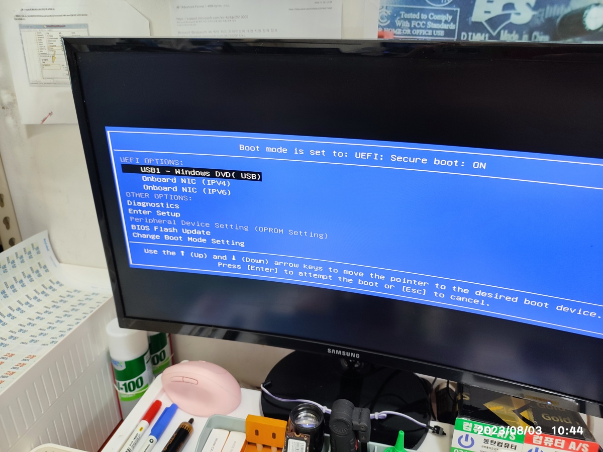 그리고 USB로 윈도우 설치하기 위해서, 부트 메뉴를 뜨웠는데요. 아래와 같이 USB1 - Windows DVD (USB)라고 목록이 뜨네요. 보통의 경우에는 USB 제조사의 모델명이 뜨는 경우가 많은데, USB에 저장된 S/W를 확인해서 띄워주는 사용자 편의 기능이네요. 신기한 기능입니다.