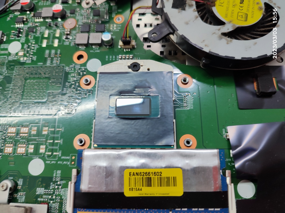 CPU 표면의 서멀컴파운드의 상태입니다. 7년정도 됐습니다. CPU 위에 서멀은 많이 굳은 상태이고요. 좌측에 있는 칩셋은 조금 뭃은 상태네요.