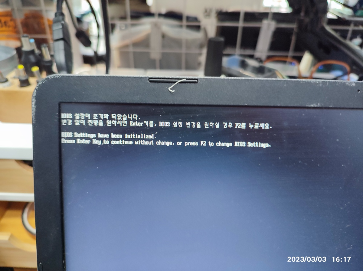 "BIOS 설정이 초기화 되었습니다. 변경 없이 진행을 원하시면 Enter 키를, BIOS 설정 변경을 원하실 경우 F2를 누르세요."