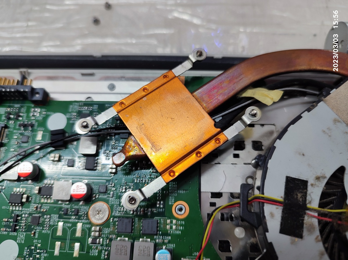 서멀 컴파운드는 오래됐지만 아직도 축축해 보입니다. 오래가네요. 방열판의 나사는 밑에 와셔가 있어서 빠지지 않는 형태이니 참고 바랍니다. 사진상으로 플라스틱으로 보입니다. 가끔 쇠붙이로 와셔를 붙여놓는 노트북도 있는데, 쇠와셔는 떨어지면, 꼭 찾아야 합니다.