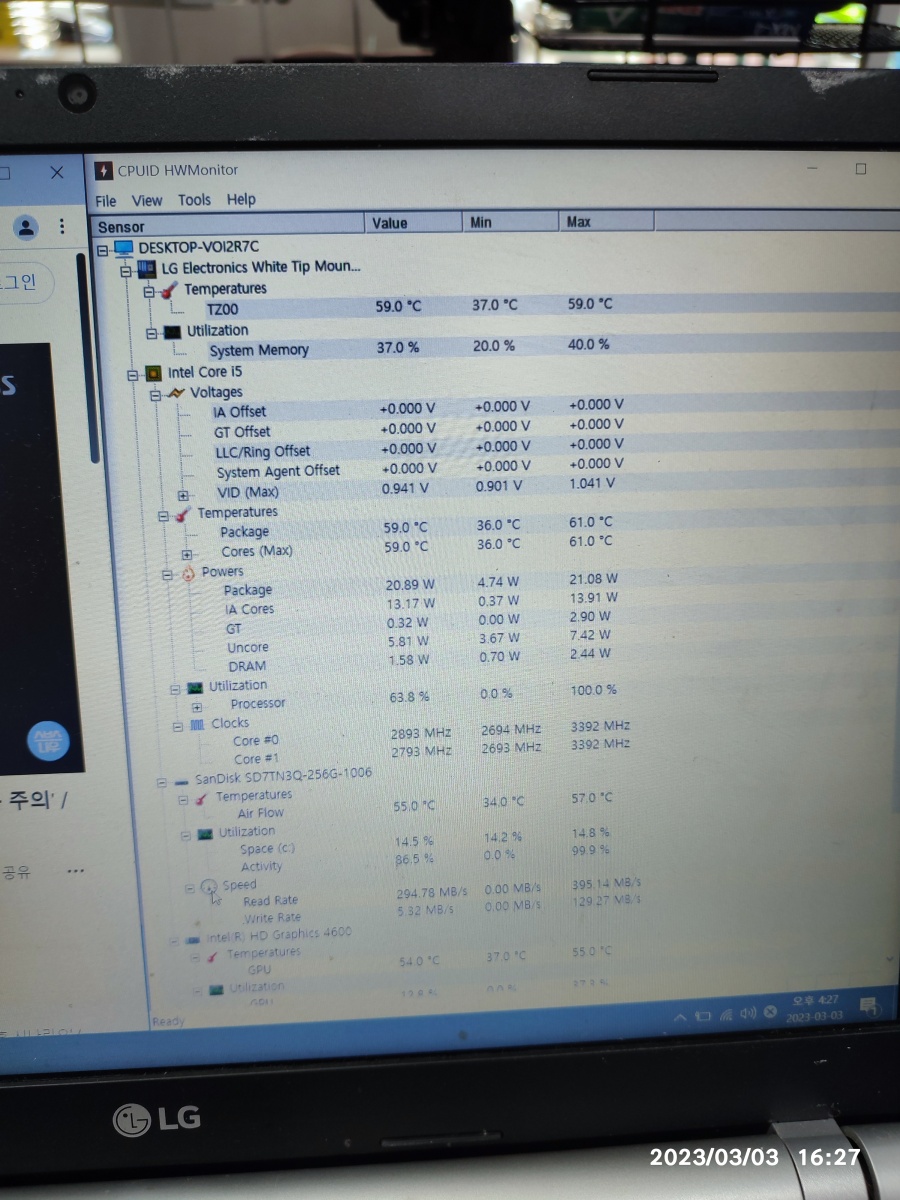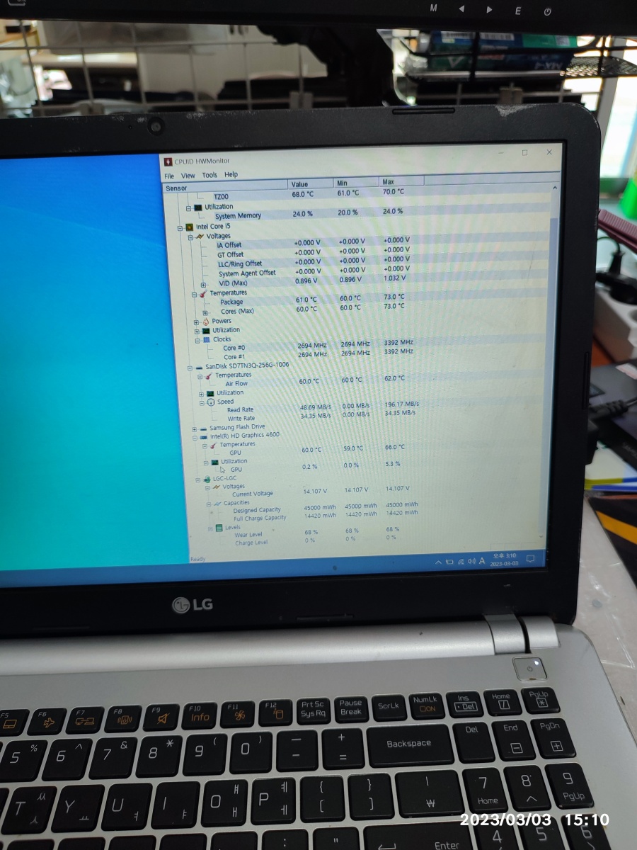 CPU 온도는 그래도 많이 떨어진 상태입니다. 61도까지 올라가네요. i5-3410M