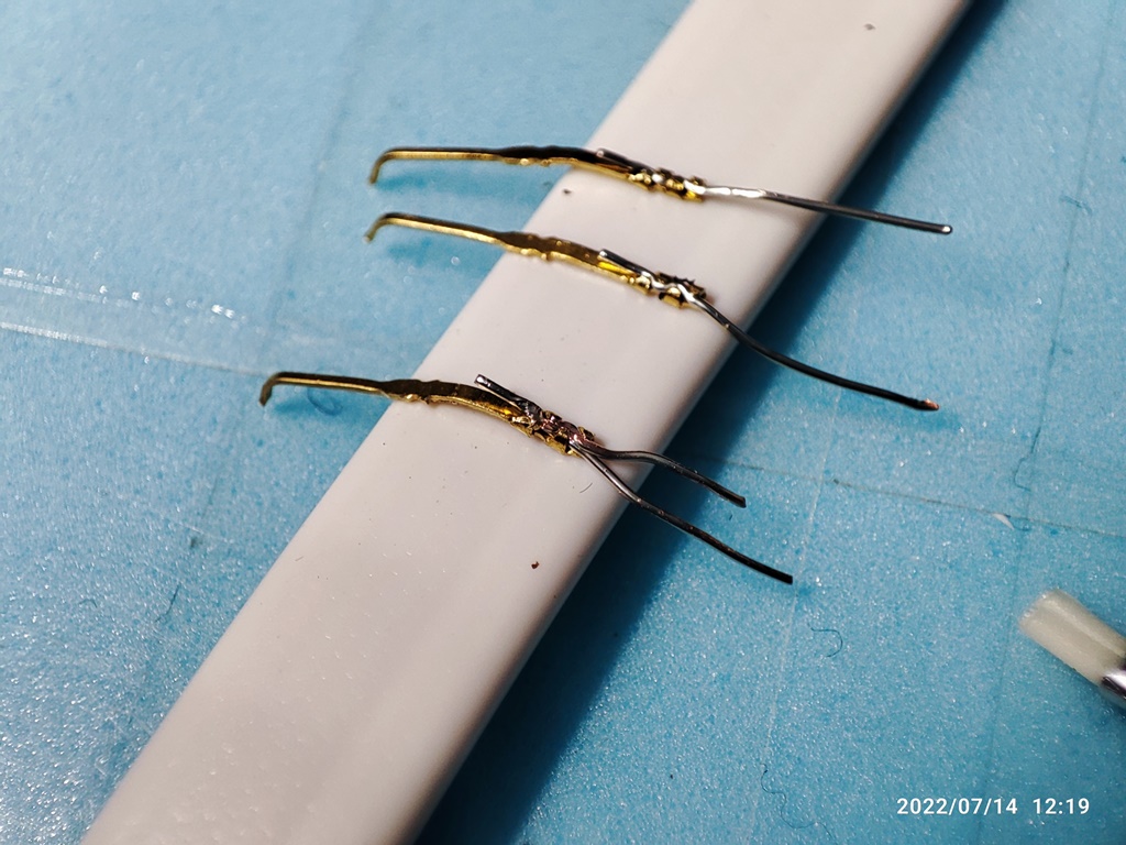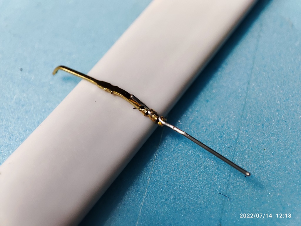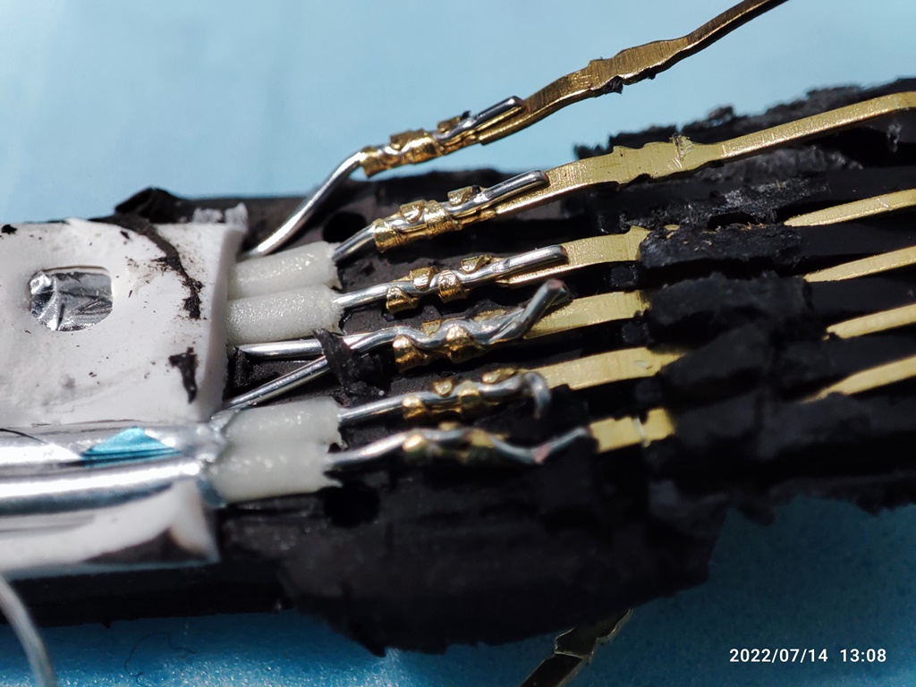 납땜의 흔적은 유관상으로 보이질 않고요. 금속 날개를 접으면서 전선을 집어놓은 형태입니다. 마치, 손아귀로 찰흙을 잡을 때, 손가락 모양으로 찰흙에 자국이 남듯이 전선에 고정핀이 눌린 자국이 보이네요.