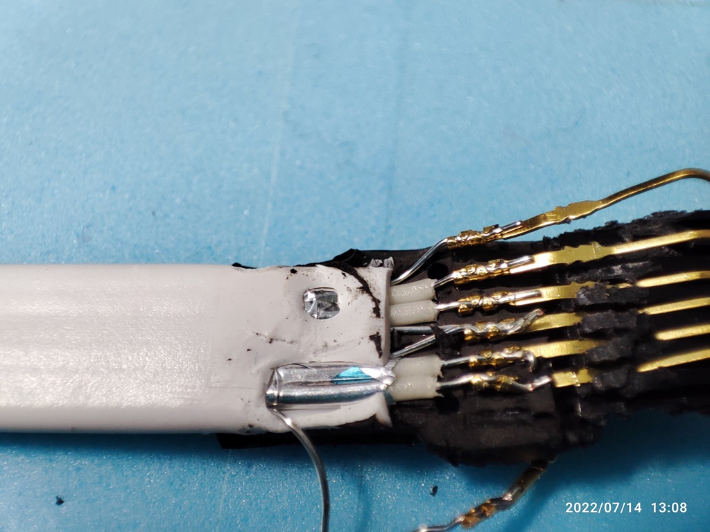 사타케이블 7개 핀사타케이블 7개 핀 중에서 하나의 핀만 2개의 전선과 연결됐네요.가운데 4번째 핀에 2개의 전선이 묶여있습니다.